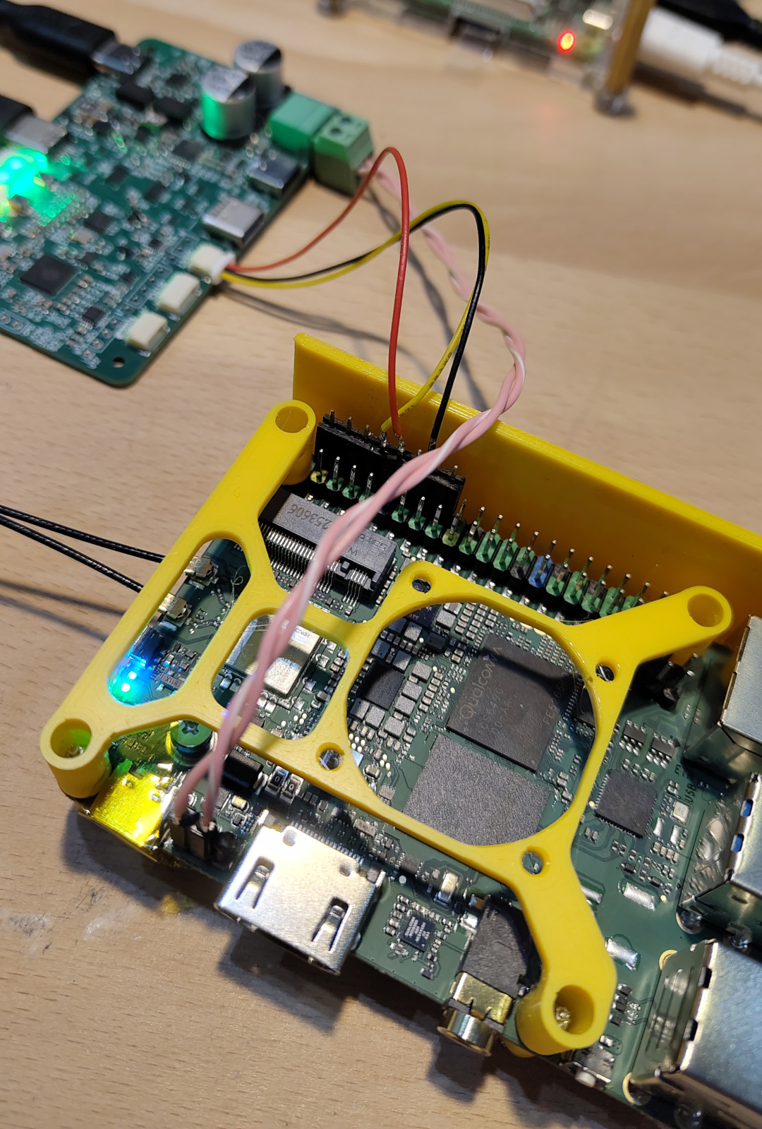 Do not connect anything to the USB-C connector of the q6a when powering through this pin header! It is hardwired to the 12V input pins and will be reverse supplied and may cause damage. It is highly recommended to seal the USB-Connector with sticky tape.